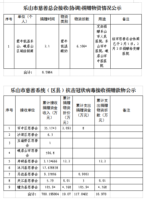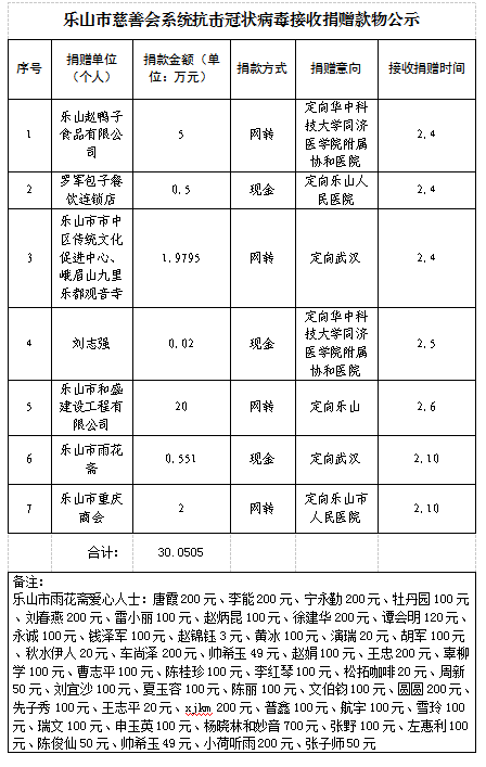 乐山市慈善总会关于抗击冠状病毒捐赠款物的公示(4)