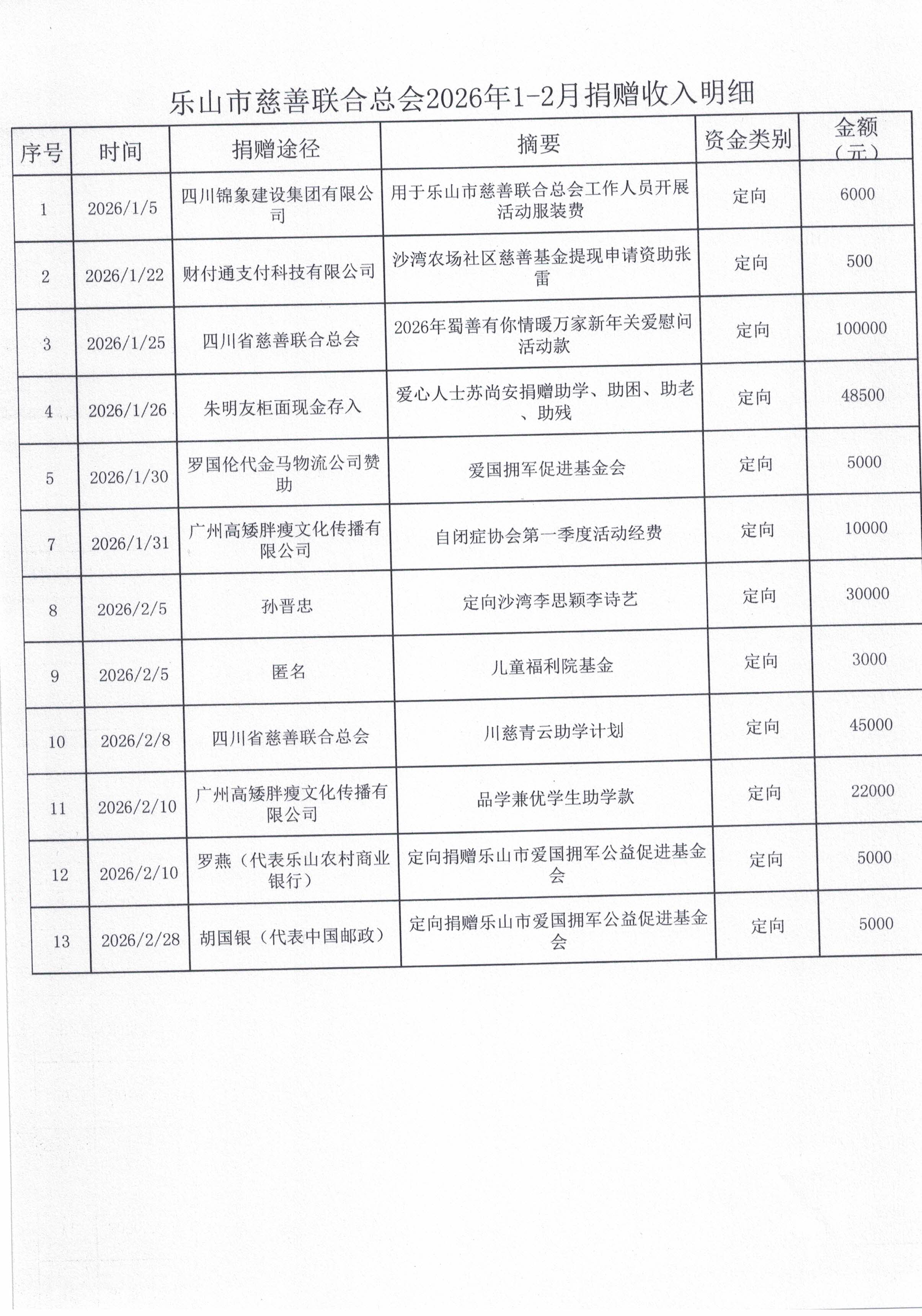 乐山市慈善联合总会2026年1-2月捐赠收入明细